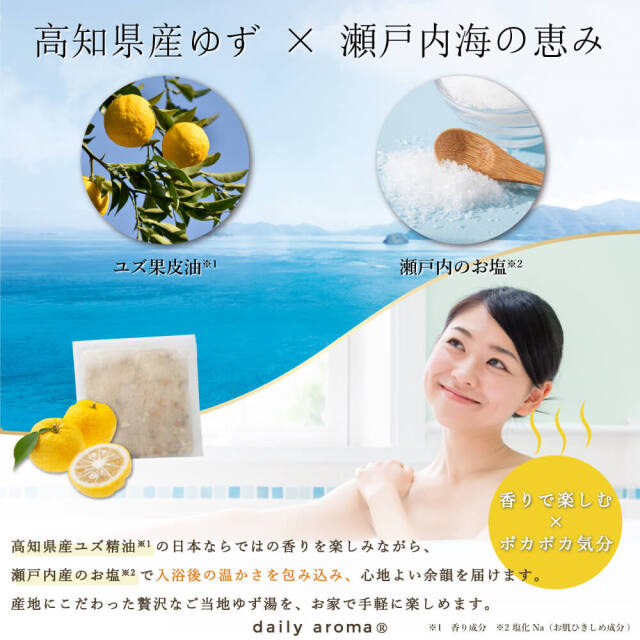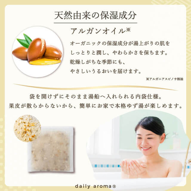 高知県産ユズ精油*1×ユズ果皮*2の天然アロマを楽しみながら、瀬戸内産のお塩*3の温浴効果と、オーガニックアルガンオイル*4でお肌をしっとり、やわらかく潤す本格ゆず湯バスソルト。内袋入りで果皮がお湯に散らばらないので、簡単にお家で本格ゆず湯が楽しめます。自然由来成分100%。