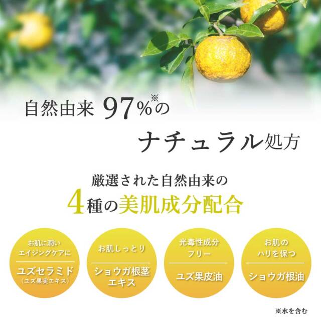 水、ヒマシ油、グリセリン、セタノール、シア脂、(アクリル酸ヒドロキシエチル/アクリロイルジメチルタウリンNa)コポリマー、ユズ果皮油*、ショウガ根油*、オリーブ果実油、ユズ果実エキス、ショウガ根茎エキス、プロパンジオール、ステアリン酸グリセリル(SE)、リンゴ酸ジイソステアリル、ポリソルベート60、イソステアリン酸ソルビタン、ブチルカルバミン酸ヨウ化プロピニル、エタノール、BG【*は植物から抽出した精油を使用しています。】