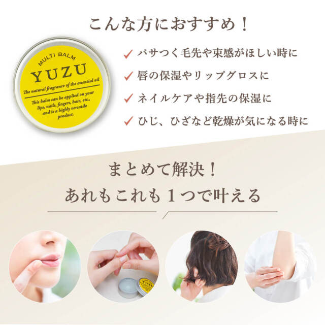 ワセリンやミツロウをベースに6種のボタニカルオイル配合したシンプル処方。爽やかなユズの香りのALL in 1バーム。なめらかにのびて高密着し、潤いを与えます。リップはもちろん、ネイルケア/ヘアワックス/ひじ・ひざなど乾燥が気になる所に/目元の乾燥小ジワ対策/肌にツヤ感を与えたい時など、マルチに使えます。コンパクトな缶タイプでコスメポーチにぴったり。かわいいおにぎり型のパッケージはプレゼントにも。