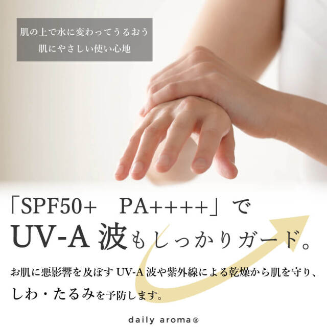 「SPF50+ PA++++」でUV-A波もしっかりガード。石鹸で落とせて肌にやさしいつけ心地にこだわりました。 パラベン、着色料、動物由来成分、鉱物油を使用していません。