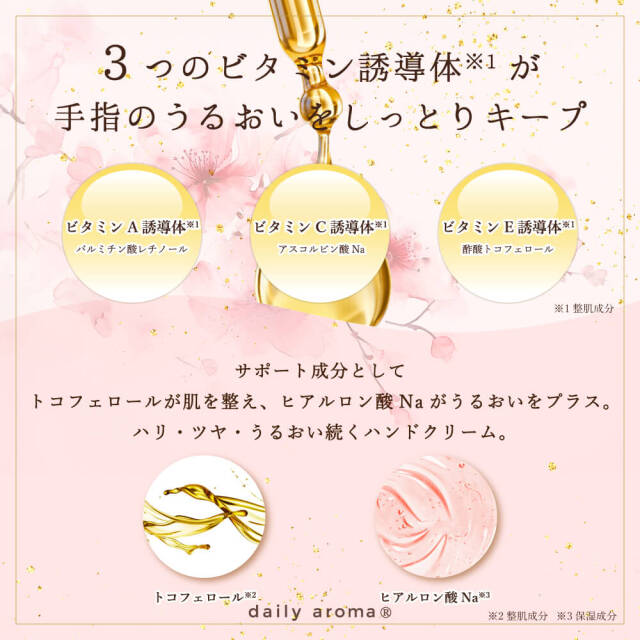 シアバター※2と3種のビタミン誘導体※3が乾燥から守りながらしっとり感をキープ。ヒアルロン酸Na※4がうるおいを重ね、なめらかで弾むような手肌へ導きます。