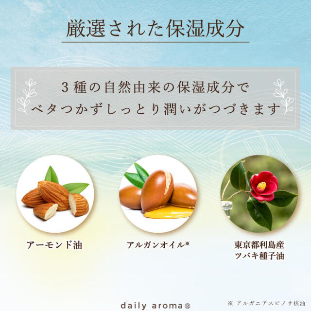 ※1 香り成分 ※2 アーモンド油、アルガニアスピノサ核油、ツバキ種子油