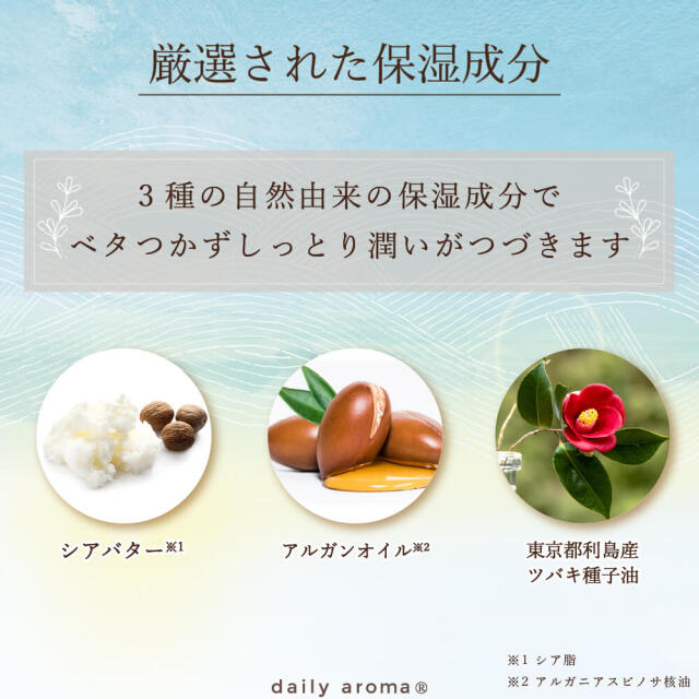 ※1 シア脂 ※2 アルガニアスピノサ核油 ※3 ツバキ種子油