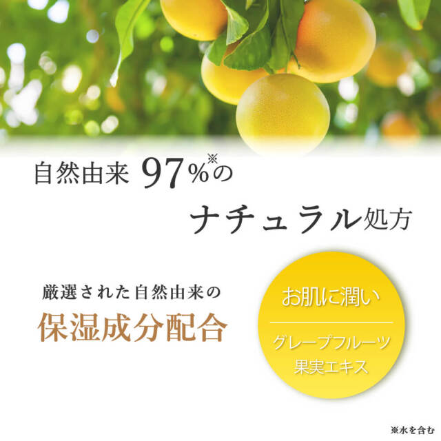 水、ヒマシ油、グリセリン、シア脂、セタノール、(アクリル酸ヒドロキシエチル/アクリロイルジメチルタウリンNa)コポリマー、グレープフルーツ果実エキス、オレンジフラワー水、オリーブ果実油、香料*、プロパンジオール、ステアリン酸、ステアリン酸グリセリル(SE)、リンゴ酸ジイソステアリル、アラビアゴム、キサンタンガム、フェノキシエタノール、ブチルカルバミン酸ヨウ化プロピニル、BG