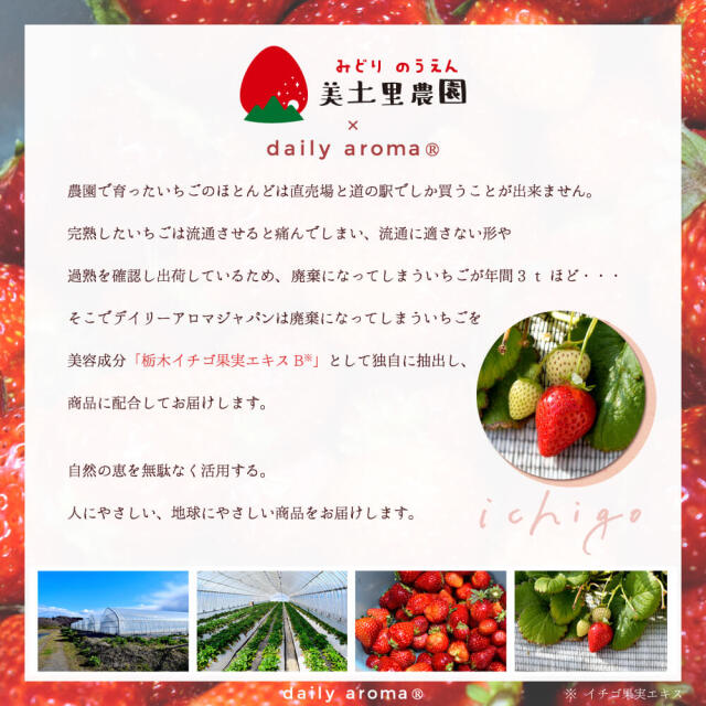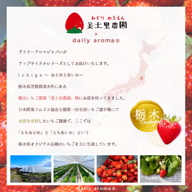 美土里農園が育てた金賞受賞いちご「とちあいか」のうち、形やサイズが規格外だったものや過熟によって流通されなかった果実を活用し、廃棄予定だったいちごから独自の方法で抽出しました。