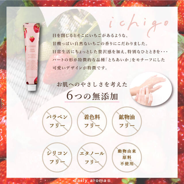 仕上げに広がるのは、甘酸っぱい、いちごの香り。使うたび、指先から果実の物語が広がります。